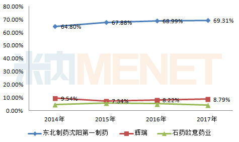 從2017年的數據看,東北制藥以69.31%的市場份額位居首位,原研廠家輝瑞以8.79%的比例緊接其后。從近幾年各大品牌的市場份額變化看,東北制藥基本呈現穩定增長的態勢,輝瑞的市場份額則有所波動。