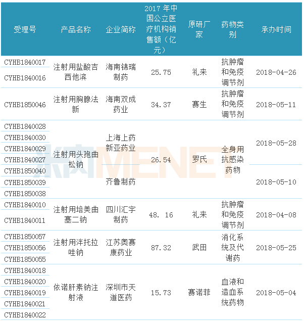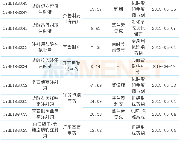 從治療類別看,14個品種中有5個為抗腫瘤和免疫調節劑,可見抗腫瘤領域是藥企們申報的重點,消化系統及代謝、神經系統藥物、全身抗感染藥物均有2個產品;從產品的申報廠家看,齊魯制藥及子公司申報的產品最多;從申報的產品看,除了注射用頭孢曲松鈉有2家企業同時申報外,其他品種均只有1家企業申報;從產品的銷售額看,2017年在公立醫療機構終端銷售額超過10億元的產品有11個(超過20億元的有8個),其中注射用泮托拉唑鈉接近90億元,注射用培美曲塞二鈉及多西他賽注射液接近50億元。