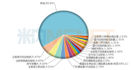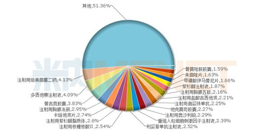 截至目前,申報一致性評價的抗腫瘤產品在2017年中國公立醫療機構終端抗腫瘤和免疫調節劑的競爭格局中均處于主導地位,注射用培美曲塞二鈉以4.13%的比例位居首位,多西他賽注射液以4.09%的比例緊接其后,注射用胸腺法新以2.95%的比例排位第四。