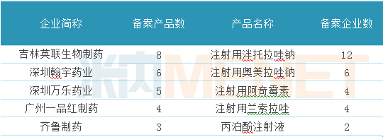 表2:注射劑一致性評價參比制劑備案企業及產品TOP5