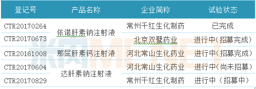 截至目前,一致性評價中準備開展/已開展/已完成BE試驗的注射劑有5個登記號,涉及企業3家,品種3個。從進行試驗的企業看,常州千紅生化藥業、河北常山生化藥業均有2個產品處于試驗階段;從試驗的產品看,有2家藥企進行BE試驗的依諾肝素鈉注射液,深圳市天道醫藥已搶先一步,其產品已經處于申報一致性評價的隊列。