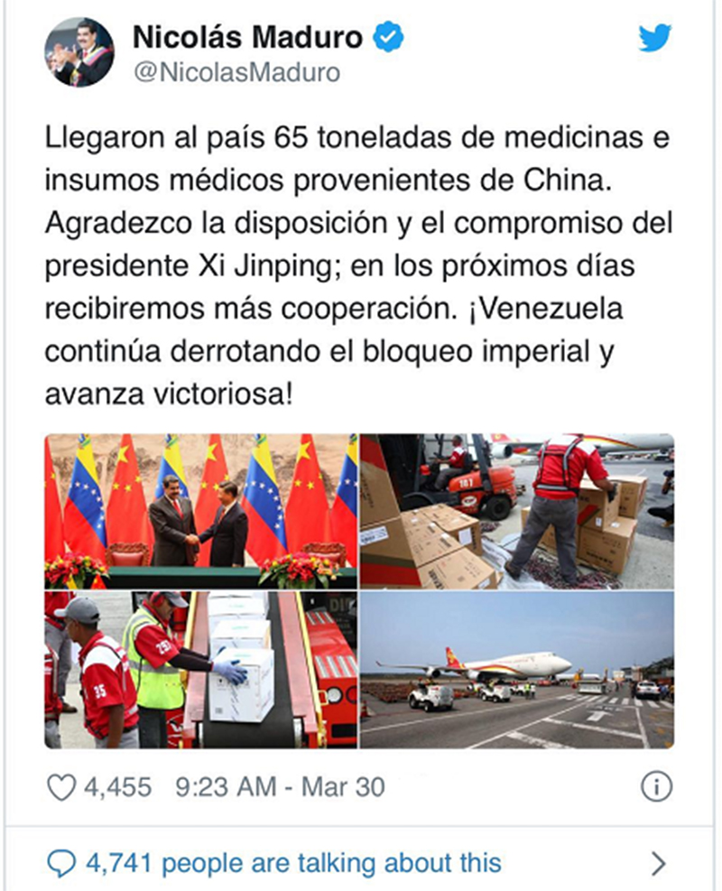 3月30日,中國(guó)政府向拉美地區(qū)派出的第一個(gè)醫(yī)療專家組到達(dá)委內(nèi)瑞拉,并帶來(lái)了第二批抗疫物資。