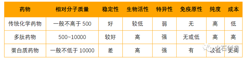 表1 多肽藥物、傳統化學藥物、蛋白質藥物比較