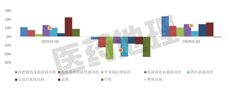 圖2樣本醫(yī)院市場TOP8治療類別近年增長趨勢(shì)(2019Q1-Q3,2020Q1-Q3,2021Q1-Q3)