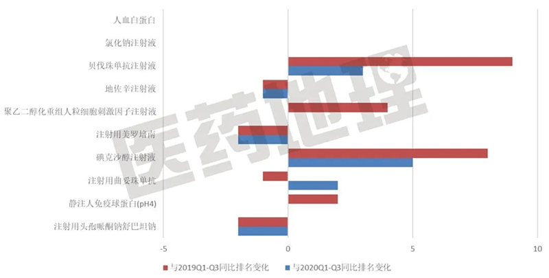 基于PDB國內(nèi)樣本醫(yī)院市場數(shù)據(jù),2021年前三季度最為暢銷的10個(gè)產(chǎn)品如圖所示,全部都是注射給藥。相較于2020年和2019年同期,人血白蛋白和氯化鈉注射液的地位極其穩(wěn)定;聚乙二醇化重組人粒細(xì)胞刺激因子注射液和靜注人免疫球蛋白(pH4)的排名相較于2020年同期無任何變化;地佐辛注射液、注射用美羅培南和注射用頭孢哌酮鈉舒巴坦鈉的排名下滑明顯;排名上升比較快的是貝伐珠單抗注射液和碘克沙醇注射液。