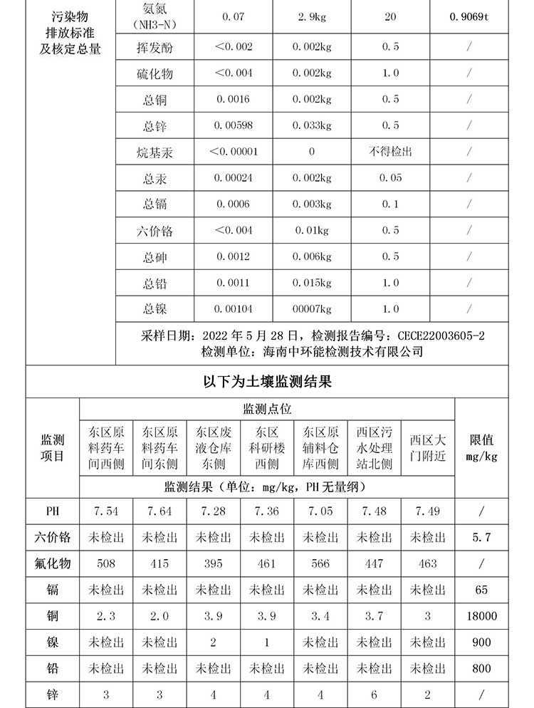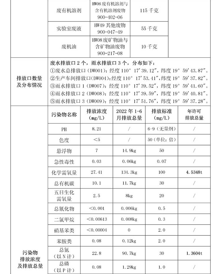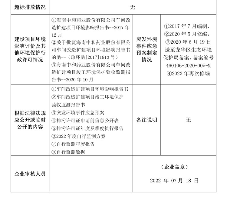 海南中和藥業股份有限公司2022年海口市重點排污單位環境信息公開表
