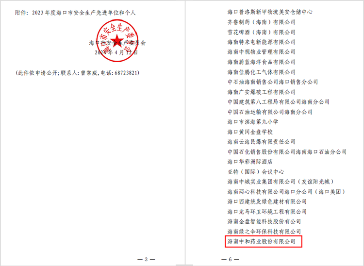 近日,海口市安全生產委員會印發(fā)《海口市安全生產委員會關于2023年度安全生產先進單位和個人的通報》(海安委〔2024〕3號),海南中和藥業(yè)股份有限公司獲評安全生產先進單位稱號。