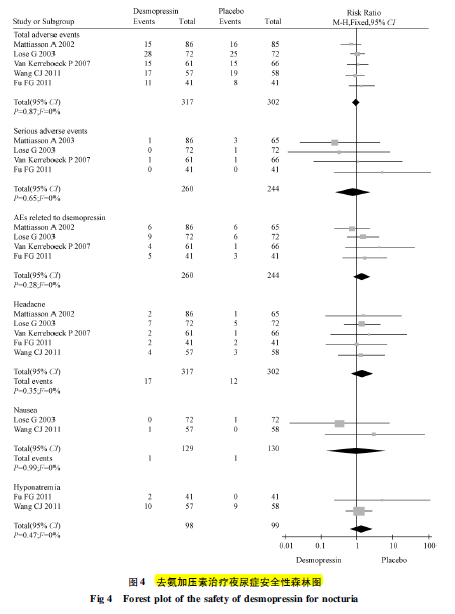 5 個納入Meta 分析的RCT 顯示,去氨加壓素組和對照劑組產(chǎn)生的總的不良反應(yīng)次數(shù)和嚴(yán)重不良反應(yīng)的次數(shù)比較,差異無統(tǒng)計學(xué)意義( 分別為P = 0. 87、P = 0. 65) 。涉及最常見的不良反應(yīng)如頭痛、惡心、低血鈉等,2組比較,差異也無統(tǒng)計學(xué)意義( 分別為P = 0. 36、P = 0. 99、P = 0. 47)。